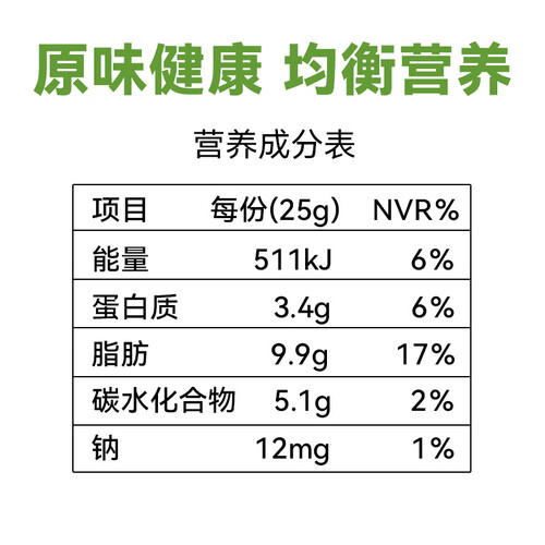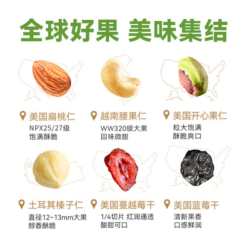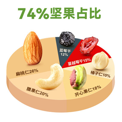除了精心挑选的果仁外,还添加了蔓越莓干和蓝莓干两种果干,让纯香的果仁多了一丝酸甜的口感。每天一包,补充身体所需物质。