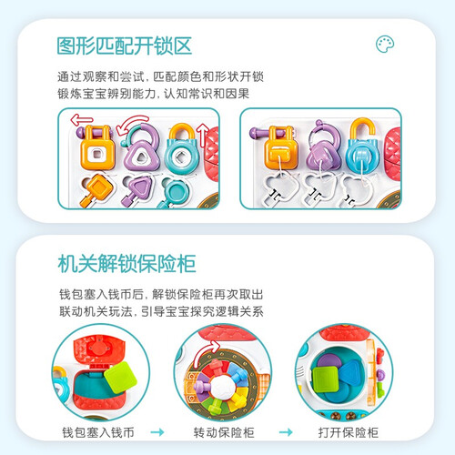 拥有9种不同的开锁方式,提升宝宝的动手能力和思维能力。图形匹配开锁区,锻炼宝宝辨别能力,增加图形和色彩的认知力。