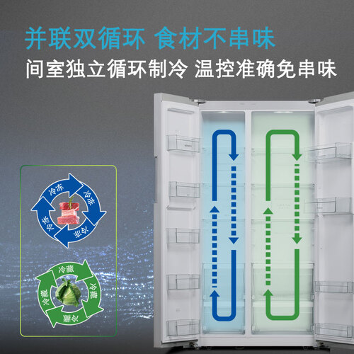 德系精工品质,采用并联双循环电机,卓效阻断异味滋生,不串味口感更纯粹。立体风冷循环锁鲜,多维出风,告别风干困扰。