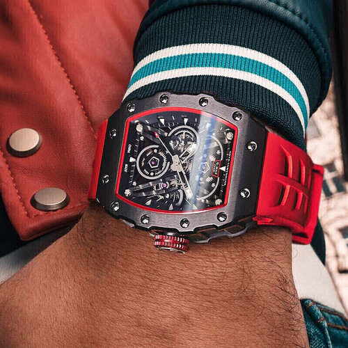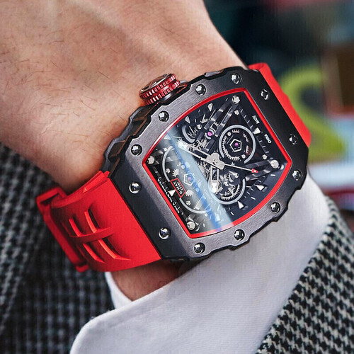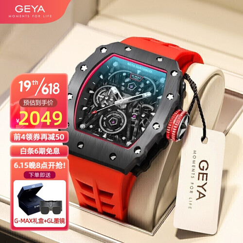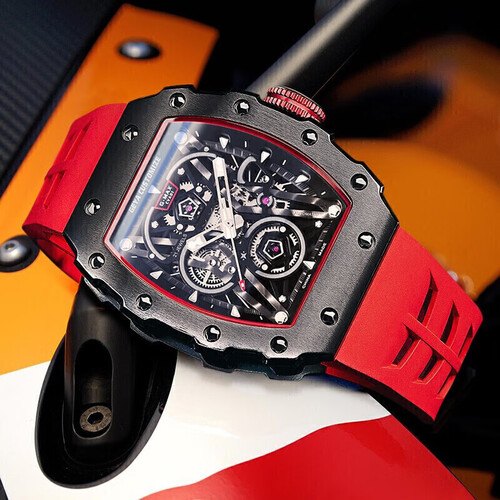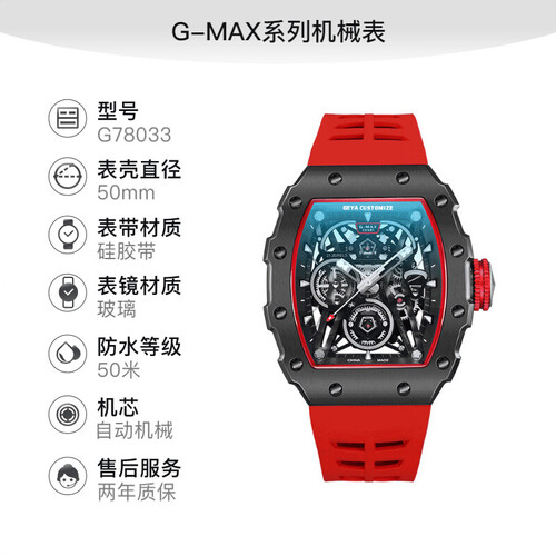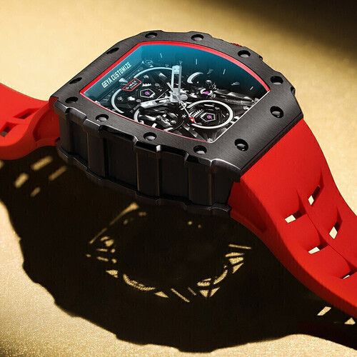 选用防水耐磨损的硅胶表带设计,带给男士不一样的质感体验。配合多层次的镂空酒桶型表盘,还产生了强烈的视觉冲击力。