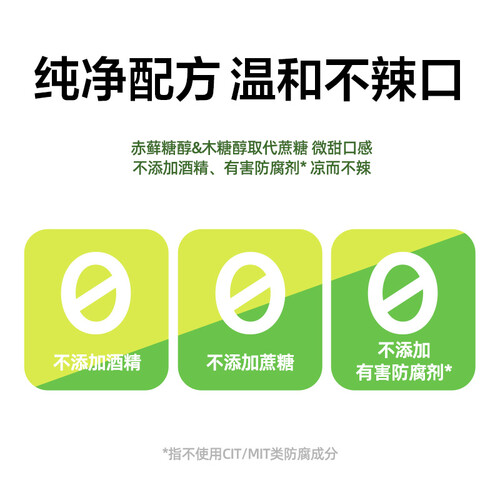 添加双重护齿的甜味剂,味道清新微甜,入喉无刺激。采用长效冰感技术,留香时间长,口腔无异味。