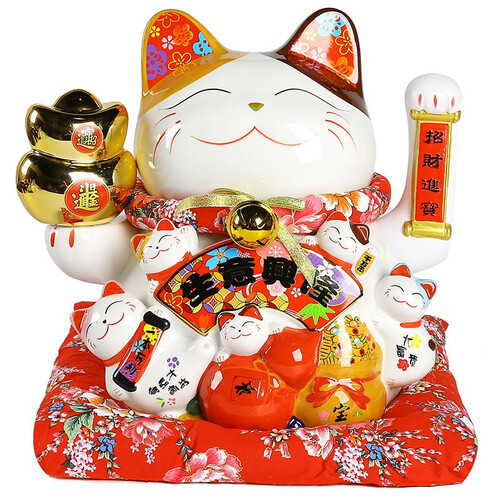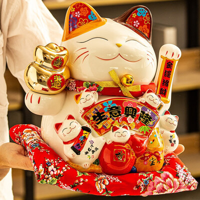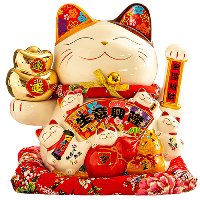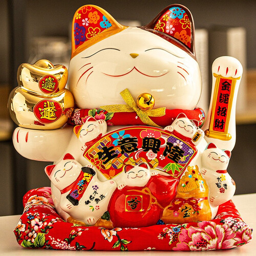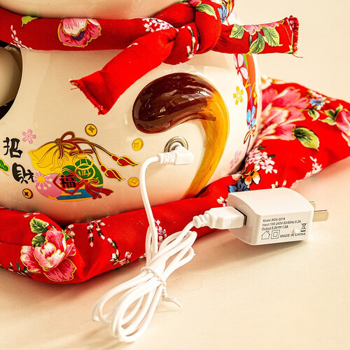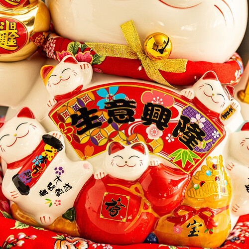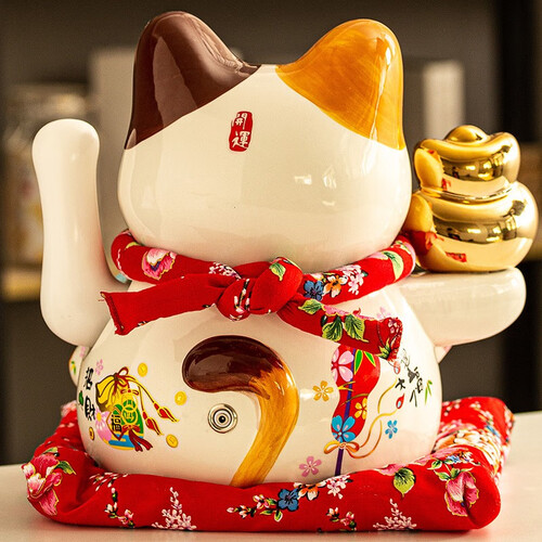 可爱萌趣的招财猫造型,做工非常精湛,招财猫手捧金元宝,寓意招财进宝,适合摆放在大堂。电动摇手功能,灵动有趣,让人一见倾心。