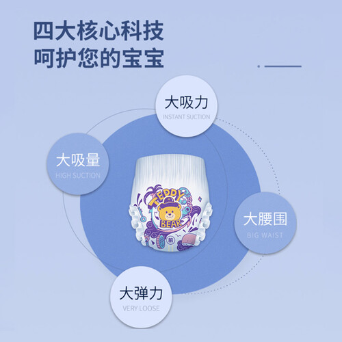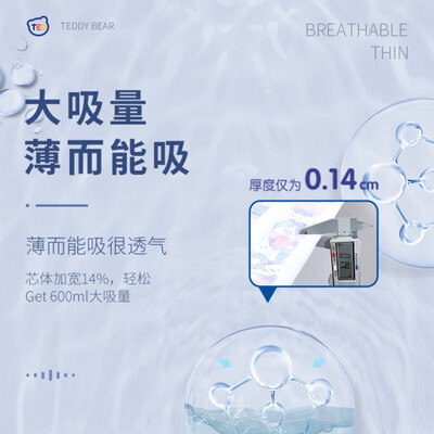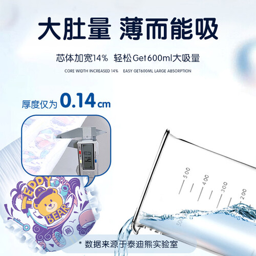 芯体采用日本进口住友高分子材质,增加吸收效果,让宝宝的肌肤持久干爽,同时让芯体加宽14%,实现600ml的大吸量。