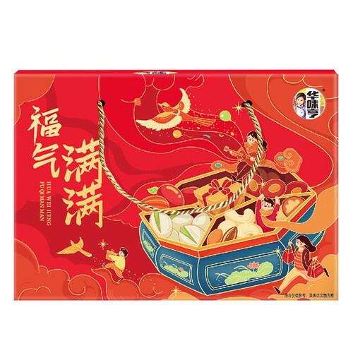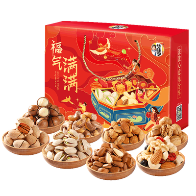 内含多种坚果和果干,坚果酥脆,果干滋润,美味享受停不下来。喜庆福气的礼盒设计,送人有面子,佳节优质礼品。