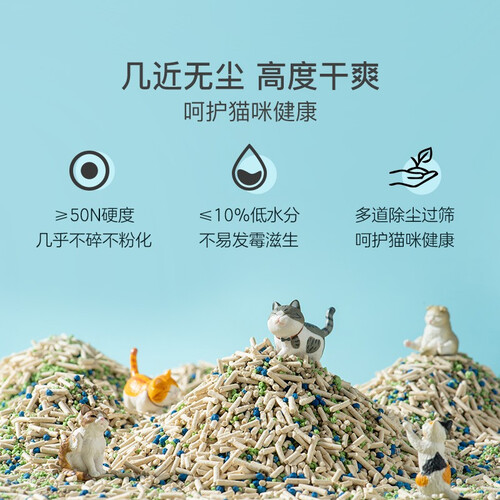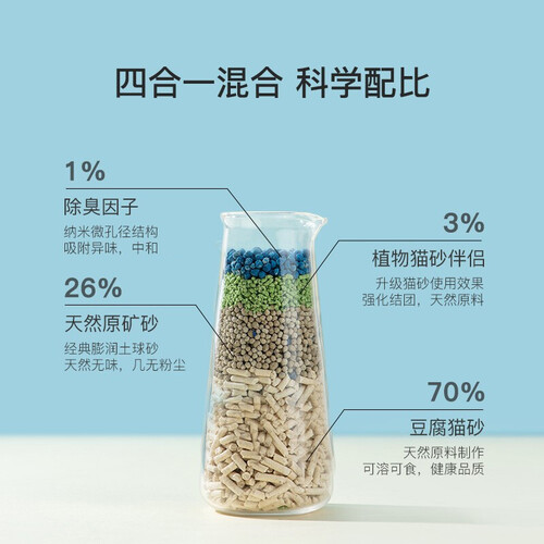 采用四种颗粒混合,互相搭配作用,粘合性加倍,快速包裹成团。特别添加除臭因子,减轻猫砂中的臭味残留,保护家中清新环境。