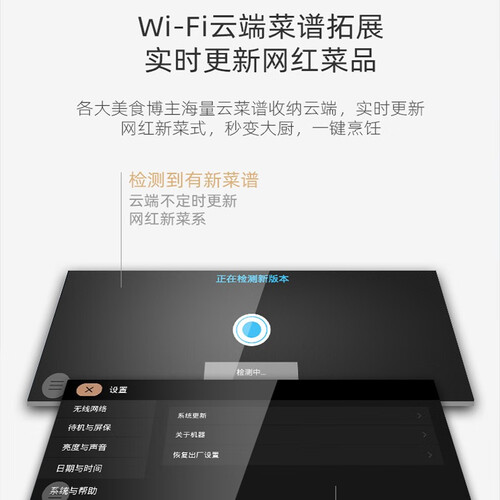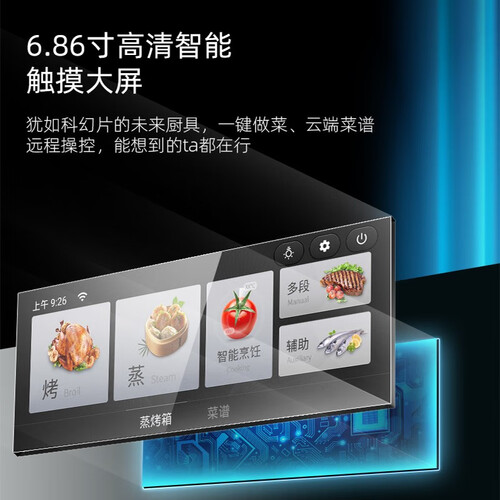 配备6.87英寸高清智能屏,通过图文并茂方式展示程序,操作灵动方便。蒸箱设有自动清洁功能,保持内腔洁净,使用干净卫生。