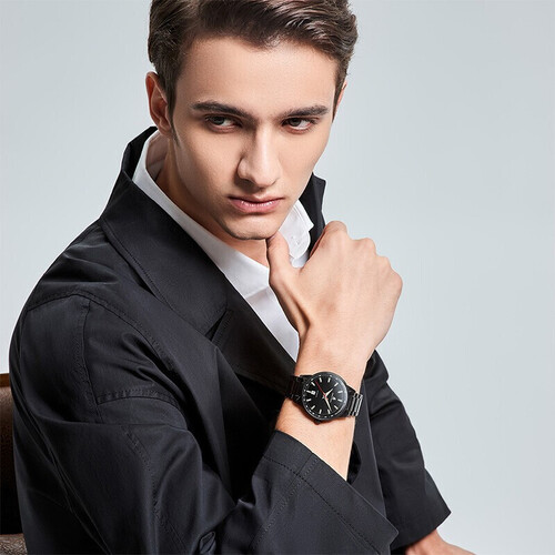 采用黑色搪瓷的表盘,搭配上红色的秒针,更显时尚质感。夜光的设计,即使身处黑暗的条件下,也能让你清晰读时。
