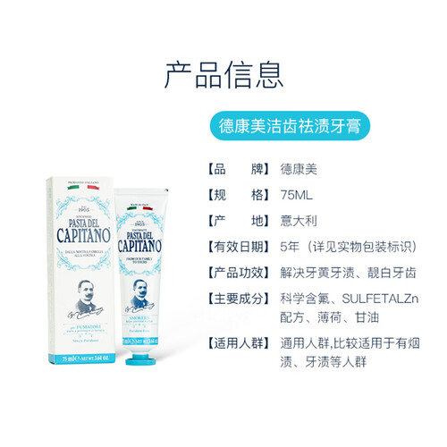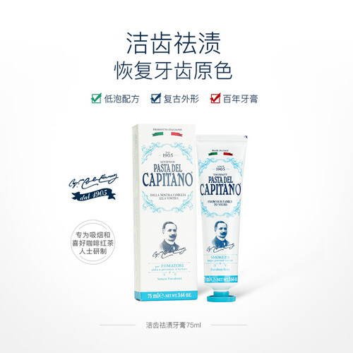 来自意大利原装进口的牙膏,拥有百年的制作经验,复古的外形也十分讨喜。专为吸烟人士打造,帮助瓦解牙齿表面牙菌斑。