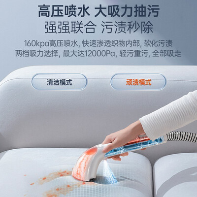 可清洁地毯、沙发的布艺洗地机,采用三虹吸口设计,保持大吸力的同时增加吸嘴面积,带走清洁后的污水、螨虫、污渍等,还不留水痕。