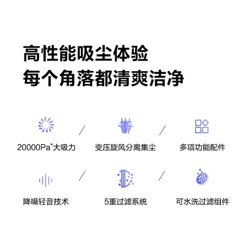 高达20000帕大吸力,大户型也可快速清洁,拒绝藏污纳垢。轻音运行,使用清洁不会发出噪音,安静使用更舒适。