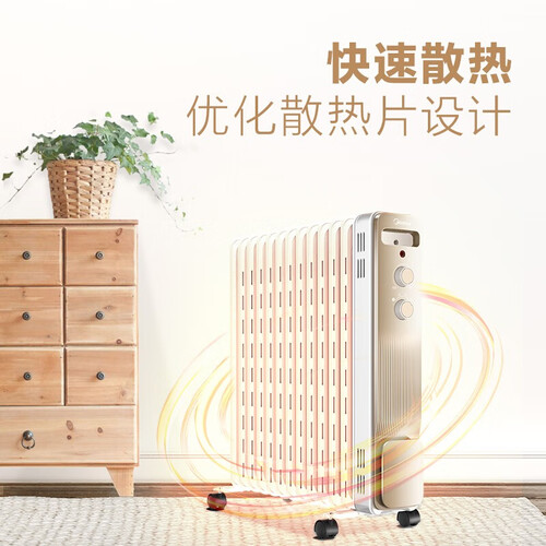 采用镂空式的散热片设计,可以使热气快速散出,屋内升温快。双尾片的设计,能起到防烫伤的作用。设置有滚轮,易于使用者移动。