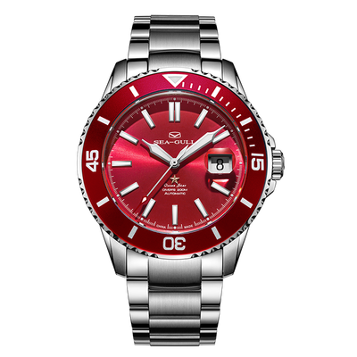 精彩的红色表盘,洋溢着浓浓的典雅风气息,展现出个性趣味的腔调感。搭配三角夜光标记,方便潜水计算氧气瓶的可持续时间。