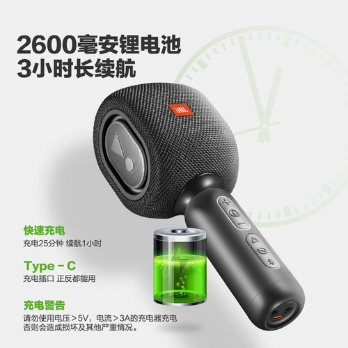 搭载PartyMode技术,实现双人无线合唱。内置2600毫安锂电池,满电续航长达3小时。