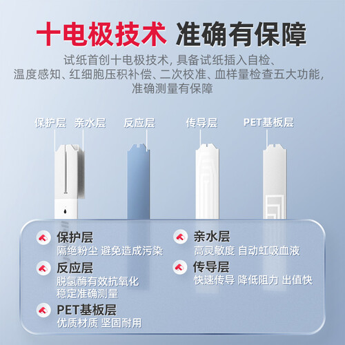 试纸升级,采用葡萄糖脱氢酶技术,抗麦芽糖、半乳糖干扰,搭配十电极技术,可二次校准结果,测量数据更准确。