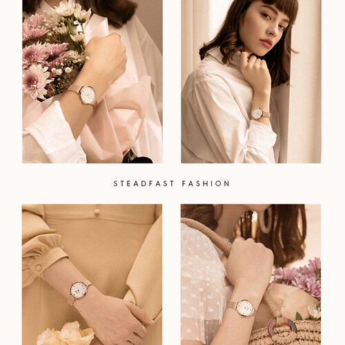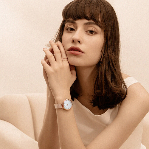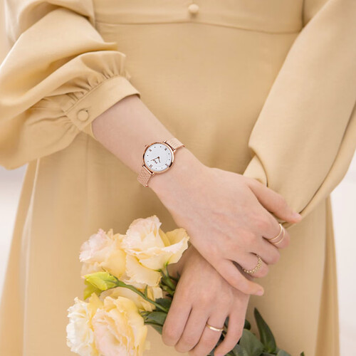 不锈钢的表带,超薄的表盘,佩戴轻便舒适,浅金色的配色,优雅清新。