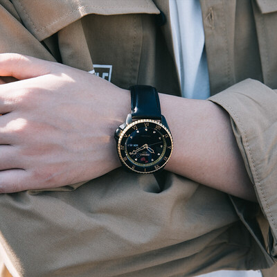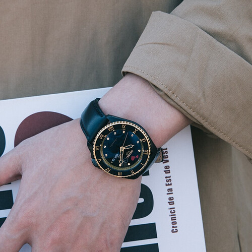 时符与餐具巧妙融合,展现的山智的厨师身份,别具一格。12时红心点缀,更显雅致与风趣。炫酷黑金拼色,彰显型男品味。