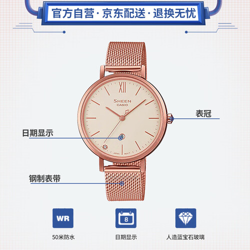 人造蓝宝石玻璃镜面,效果通透结实耐磨,更加经久耐用。50米的防水性能,可以自如的应对生活用水,更加轻松自在。