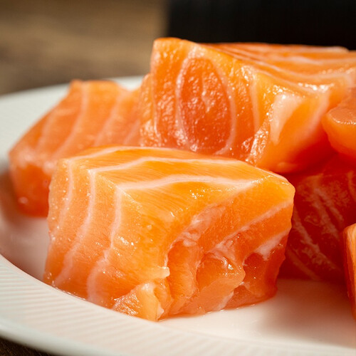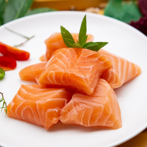 肉质鲜美细腻,香嫩多汁,橙红色泽自然鲜亮,口感爽滑弹牙,嚼劲十足。天然新鲜三文鱼,营养价值高,食用更健康。