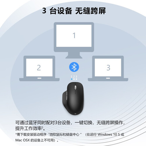 微软这款鼠标支持通过蓝牙配对连接三台设备,一键快速切换无缝跨屏操作,提高办公效率。