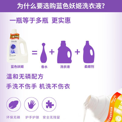 去污配方衣物柔软,深层去渍无残留,温和清洗不伤手,蓝色妖姬瓶身图案。