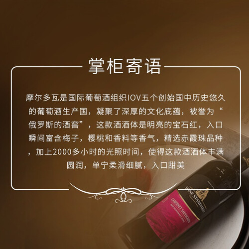 甄选优质的酿酒葡萄,加入黑加仑、黑樱桃等原料,散发出浓郁的果香,口感优雅均衡,酒香饱满。漂亮的宝石红色,色泽更细腻。