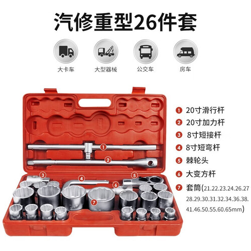 优质材质精工打造的套筒,结构坚固不易破损,能够承受更大的扭力范围。配备加力杆,重型汽修也能轻松应对。
