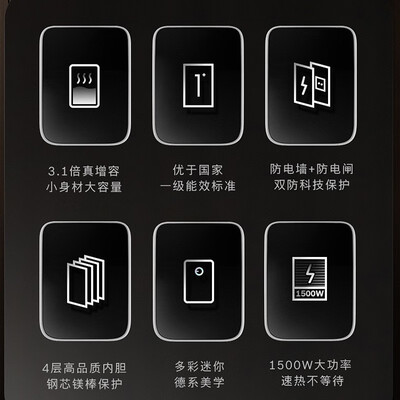 3.1倍增容科技,5L容量搭配1500W大功率可以实现快速加热支持,持续出水量可达15.5L。双重防漏电设计,安全用水。