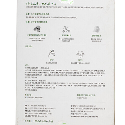 采用奶皮膜布,上脸使用服帖透气,能够持续润养脸部肌肤。添加光甘草定精粹,可以防止肌肤暗沉泛黄,让肌肤能够保持白皙光彩。