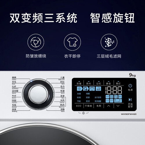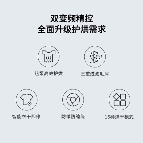 拥有智能的湿度感应装置,自主调节烘干时间,省心烘衣更便利。双变频系统,快速烘干衣物,持久稳定,呵护心爱衣物。