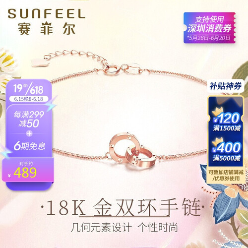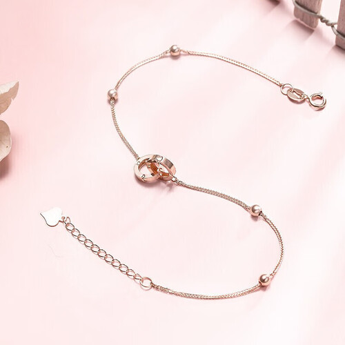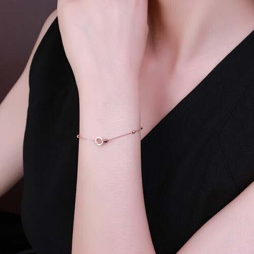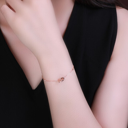 清新的造型,新颖时尚。双环设计,有着美好寓意,仿若两人心心相惜,玫瑰金色手链,戴上更显手白。