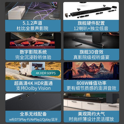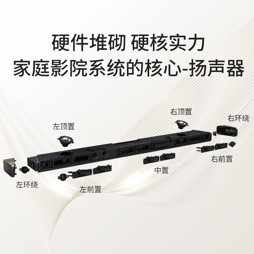支持杜比特全景声技术,强化环绕声效,带来更具立体感的声音效果。应用无线有源低音炮,满足爆炸音感的需求。