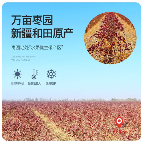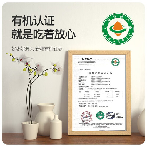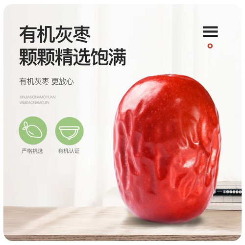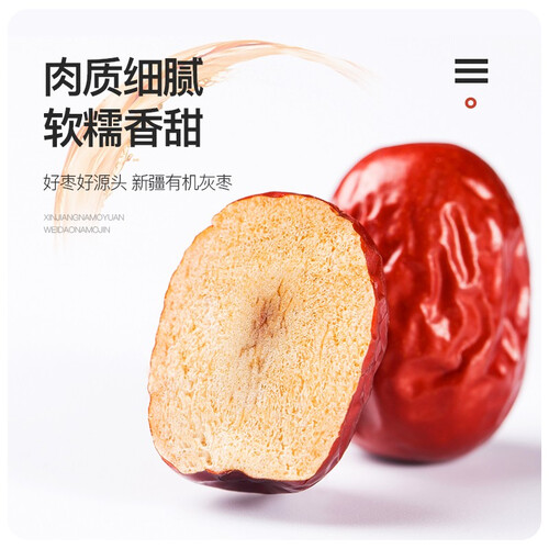 连续获得5年有机认证,给予家人享用健康美味,食用更有营养。产自于新疆和田,常年昼夜温差大,种植出的红枣细腻香甜。