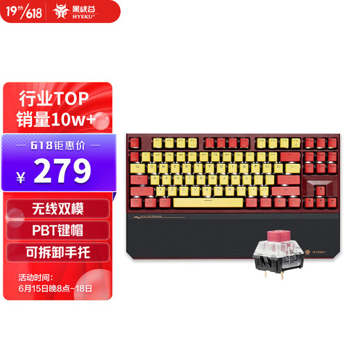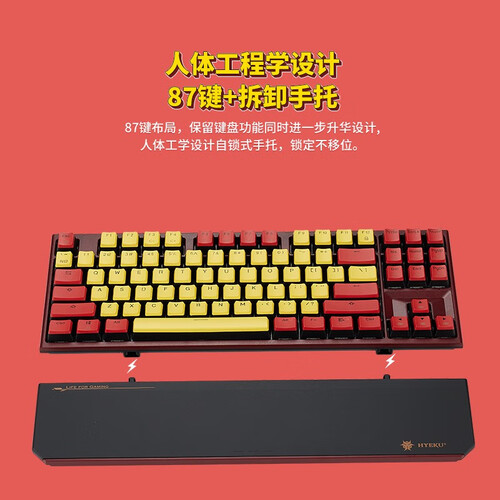 PBT键帽,手感稳定,抗汗防滑,敲击更舒适。而且自带可拆卸的手托,减缓手部疲劳,更具人性化。