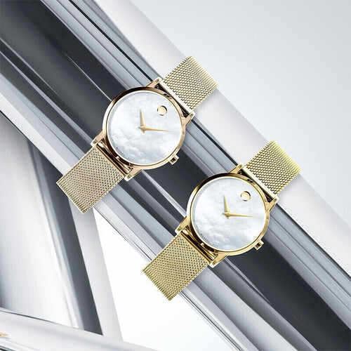 白色珍珠贝母盘面设计,简约时尚,散发天然焕彩,映衬白皙肌肤,展现空灵温雅气质,镀金钢表壳,细致抛光,亮眼夺目。