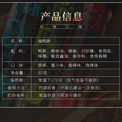 选取优质的鸭脖原料,确保每一根鸭脖都个大肉多,吃起来更过瘾。双层包装的设计,也可以保留鸭脖的新鲜美味。