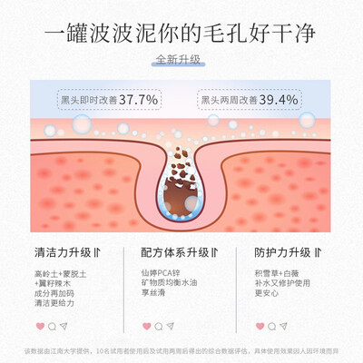 所含强大吸附力可以带走毛孔里的脏污,还肌肤白嫩干净。添加积雪草和白薇提取物,温和舒缓肌肤,强韧肌肤屏障。