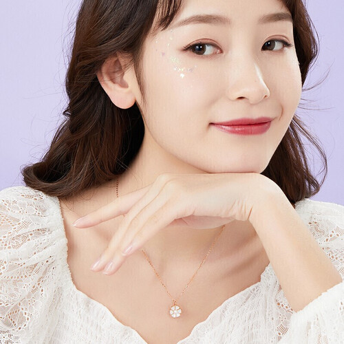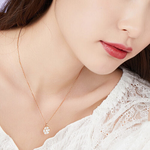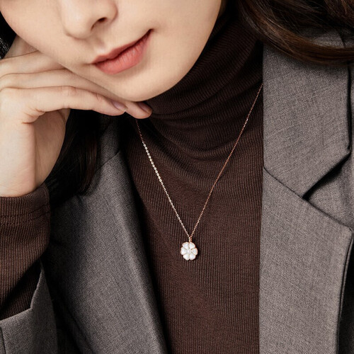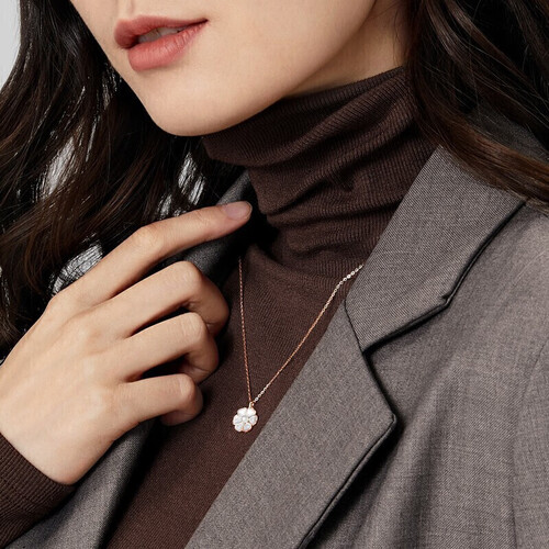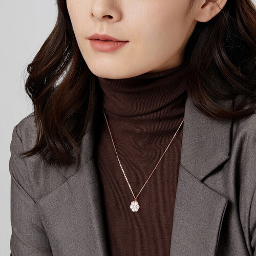 镶有珍珠母贝的花形项链,散发出柔和淡雅气息,更显女性温柔俏丽气质。尾部叠加附带延长链,简易控制所需长度,佩戴舒适自在。