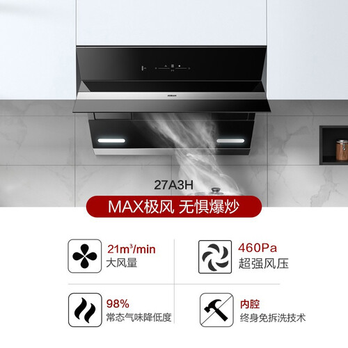 搭载极风模式,瞬间提升风量,强劲的吸力快速除去油污。460Pa的短径直排,大尺寸的风轮便于快速排出油烟,空气清新。