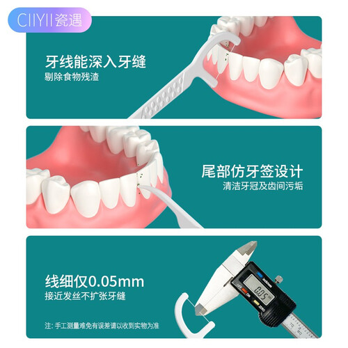 深入牙缝,剔除食物残渣,弥补牙刷及牙签的不足之处;尾部仿牙签设计,帮助清洁牙冠及齿间污垢,设计更贴心。