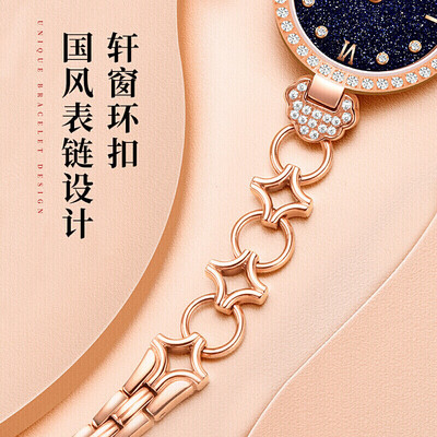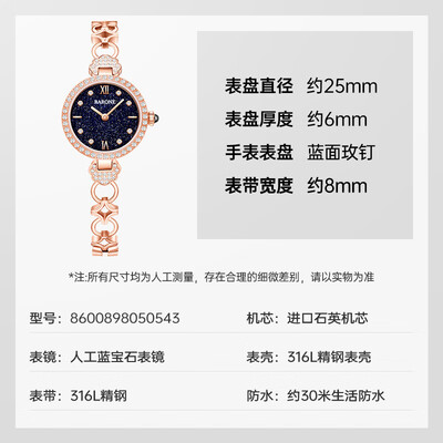 手表重量约0.029千克,佩戴更加轻盈,让手腕轻松自如。手链式设计,整体纤细,上腕可以反衬出手腕小巧纤细。