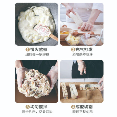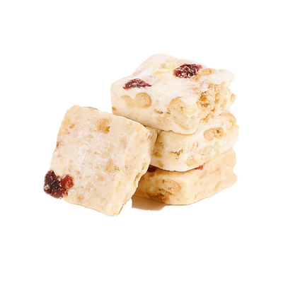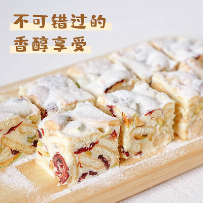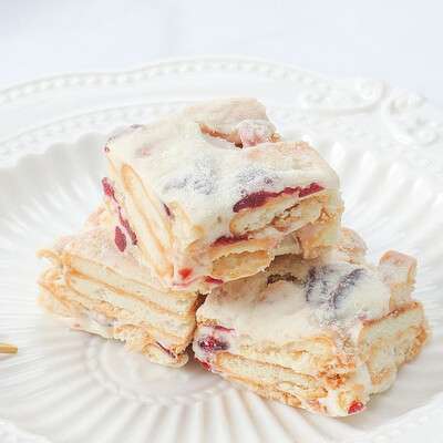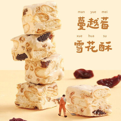 选用全脂乳粉和沙琪玛为原料,经多道工序制作而成,吃起来脆爽不粘牙,蔓越莓的点缀让雪花酥更加美味,醇香不腻,百吃不厌。