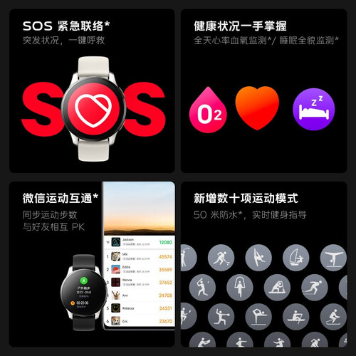 支持SOS紧急求救功能,快速发出信号,保护安全。采用智能体感操控技术,抬起手腕即可点亮屏幕。