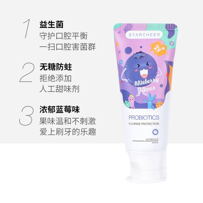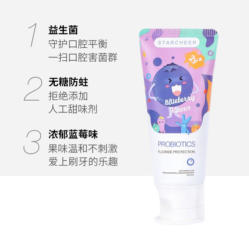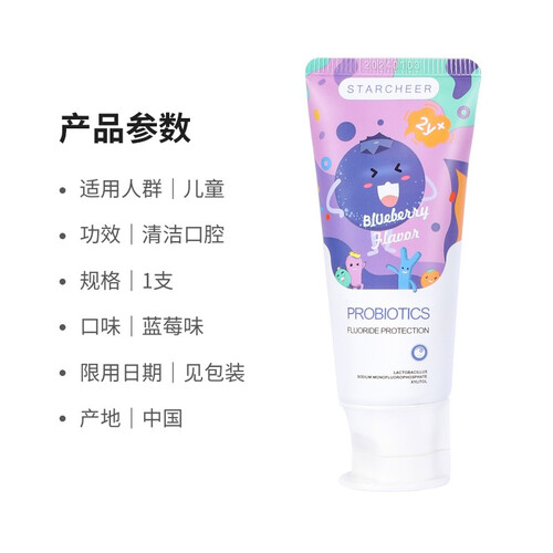 0.08%的含氟量,即安全又有防蛀效果,强健宝宝的牙齿。清新的蓝莓香味,味道清新,成分温和,让宝宝爱上刷牙。