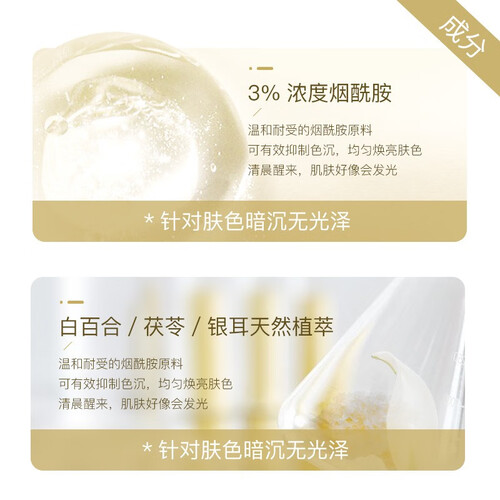 寡肽物质,修复肌肤损伤,加速新陈代谢;3%浓度烟酰胺,有效抑制色沉,均匀焕亮肤色;具有多孔特性,起到平衡油脂的作用。
