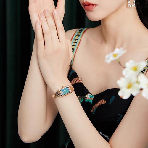 孔雀石绿的外观,采用复古风格设计,演绎出国潮高雅瑰丽之美,佩戴更衬典贵气质。玫瑰金外观的表带,时尚美观,兼具可提亮肤色。