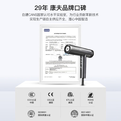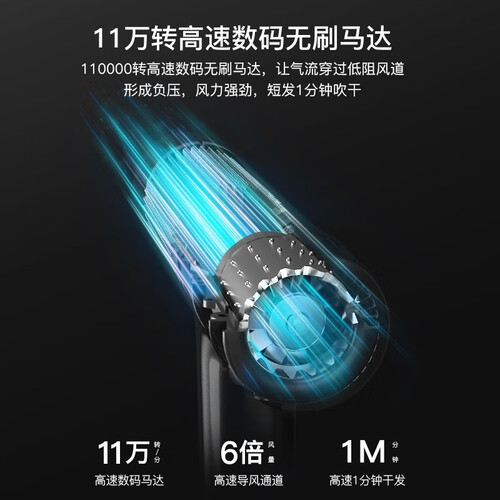 搭载11万转/分钟的高速无刷电机,带来强劲气流,吹走头发水分,快速干发更省时。采用高速导流设计,减少风力阻损,风量更大。