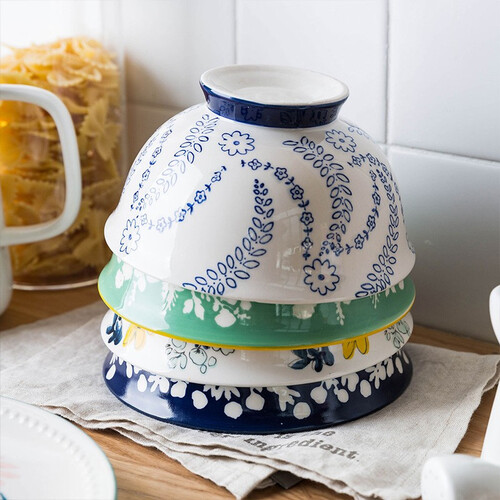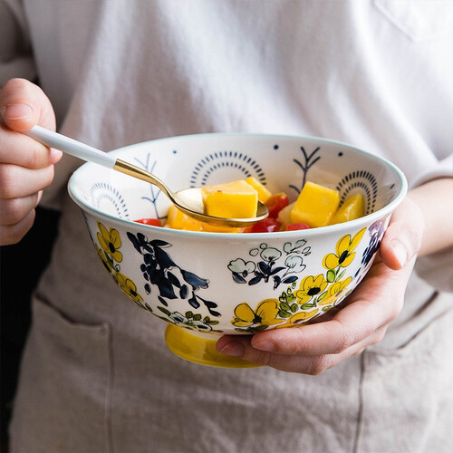 底部高脚的设计能有效的隔绝热意,防止盛放食物时烫伤。精湛的手绘釉下彩工艺,釉面色泽饱满。细腻柔滑,触感舒适。