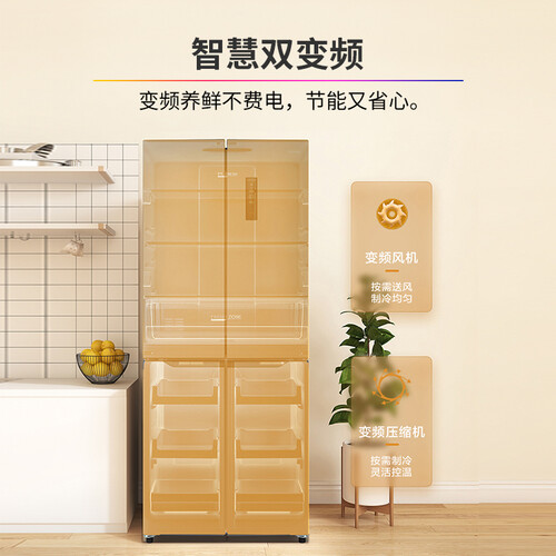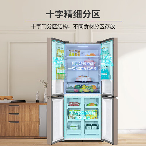 智慧双变频系统,持久养鲜更节能省电,温度波动小。十字精细分区,食材分别放置,保留原始味道。