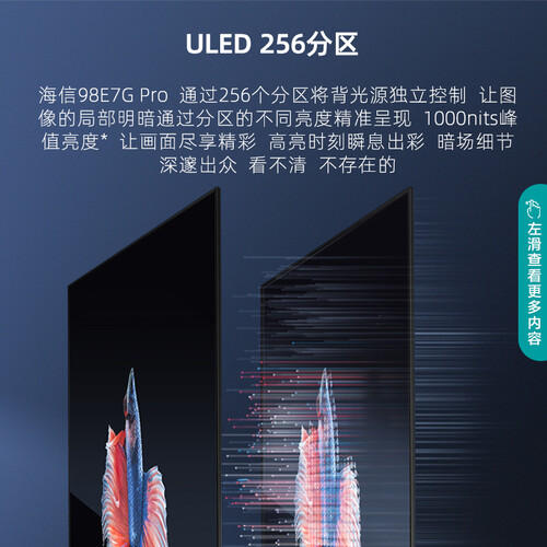 ULED百级分区,灵活调控局域光源,立体丰富图像层次,带来沉浸观影质感。信芯U+超画质芯片,加倍放大细节,观影更生动。