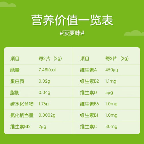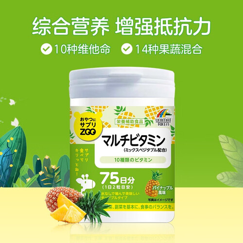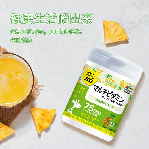 日本进口维生素咀嚼片,含高达10种维生素,搭配14种蔬菜混合粉,营养价值高。清新的菠萝口味,直接咀嚼吃食。